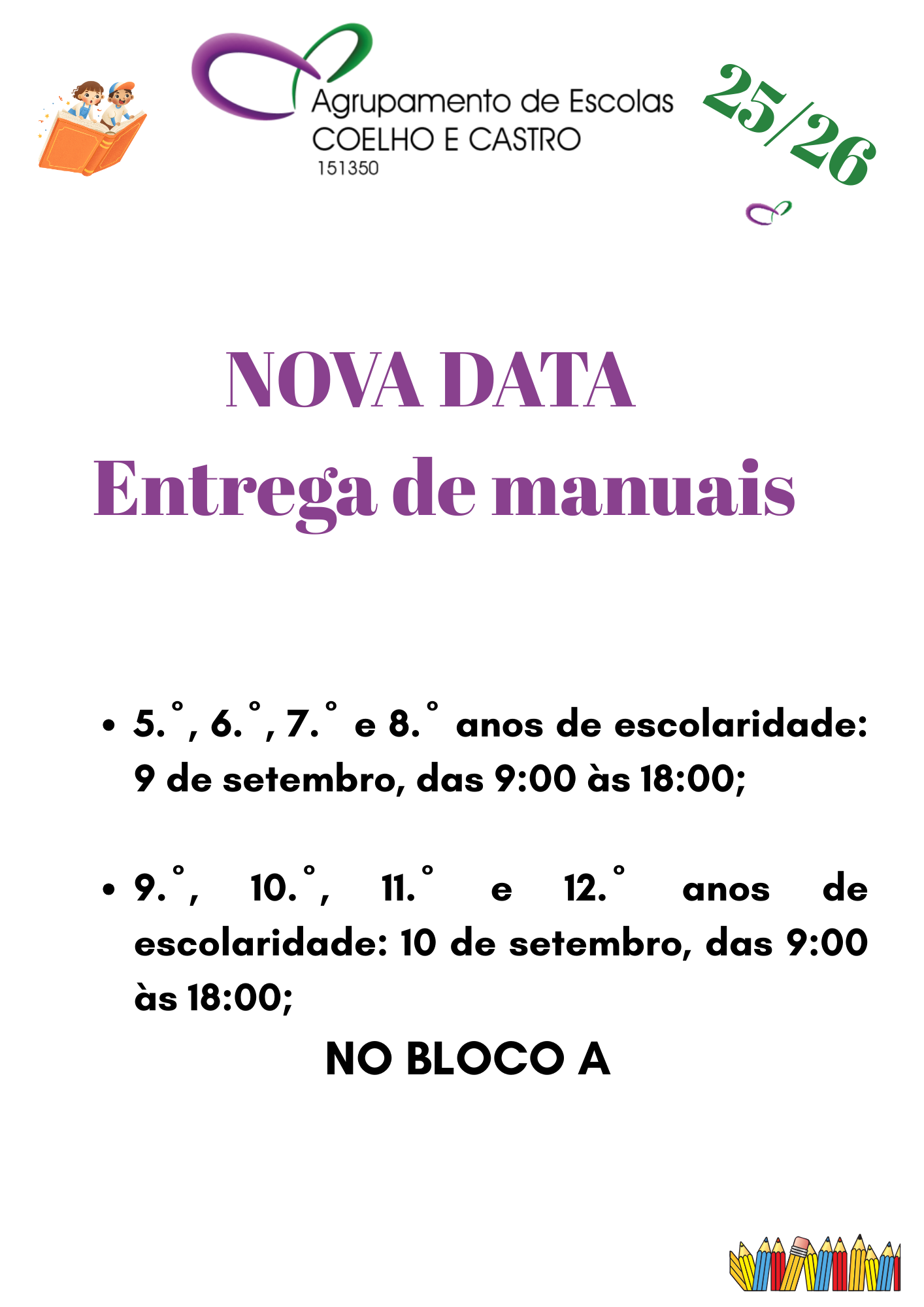 Informa-se os encarregados de educação que a entrega de manuais escolares para o ano letivo 2025/2026 decorrerá na escola sede, no bloco A, de acordo com a calendarização seguinte: